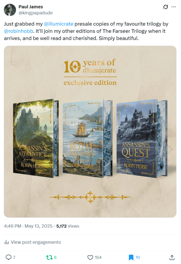 I did pre-order what I believe will be my last special edition of The Farseer Trilogy. I have four different versions of these and even I have to admit that this is enough. Original, 20th Anniversary, Illustrated, and now these so I feel my collection is strong. I posted about this on my socials and Robin Hobb reposted it, which led to the most engagement I’ve ever had!