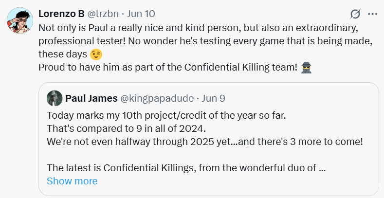 Moving on from UrbX, I realised over the last 15 Days that even though it’s only June, I have already exceeded the number of projects I tested and contributed to in 2024. And the one that broke my previous record? Confidential Killings by BRANE and Lorenzo B. I admit that as soon as I played the demo, I was in love with it, and the art style is something I never tire of. Plus, the two minds behind it are incredibly clever, funny, and creative. Although I suspect Lorenzo would probably disagree with me.