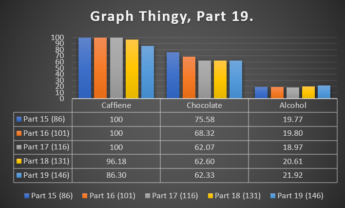 Fitness update and comparison: Another graph below to show the caffeine, chocolate and alcohol tracker. Picking up with day 6 after I stopped drinking coffee, it was more cravings, more aches, and then it was over. I’ve been tempted twice but held strong. My sleep has improved and aside from a day or two of tiredness, I feel really good. I can’t help but feel that my body has been propped up with caffeine for so long, it’s starting to readjust and demand more rest and food while it finds its natural equilibrium but, overall, the caffeine dropped by nearly 10% and I am feeling good.
