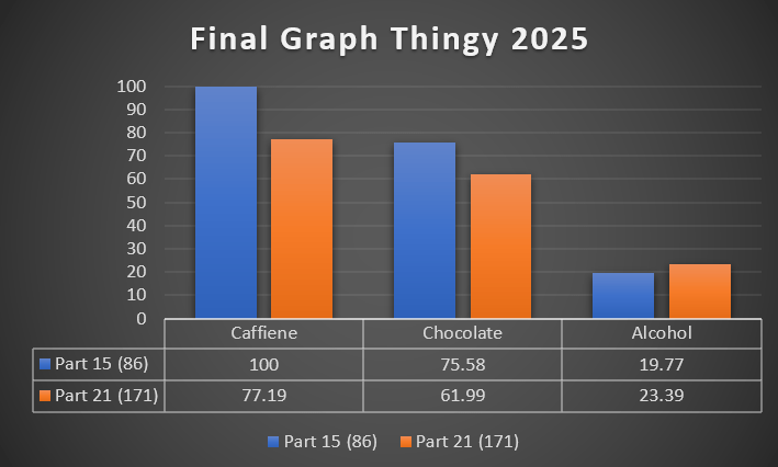 Fitness update and comparison: This will be the final one for the year. I’ve tweaked the graph to only show the start in July (Part 15) and now. It was getting a little too busy for my liking. I can be happy with the progress made because I am a big believer in continuous improvement, however large or small it is. To see caffeine reduced to an occasional treat or as a pick-me-up is a great win for me. Chocolate decreased and stayed steady but I am disappointed that this is the case, albeit an improvement on that embarrassingly high percentage in the beginning. As for alcohol, my true aim was to partake during celebrations, holidays, and catch-ups with friends and loved ones. On the whole, that has been the case. Truthfully, I am glad to see the statistics across the three because however you look at this, in particular for chocolate, 61.99% of the total 171 days is awful. That’s 106 days where I ate chocolate, and I am not going to hit my long-term goals with these numbers.